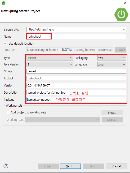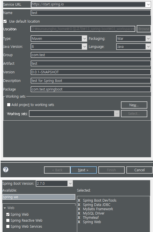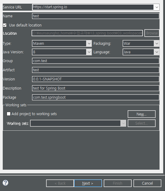 > 버전, 패키지명, 타입 등 선택하고 dependency 추가하여 생성